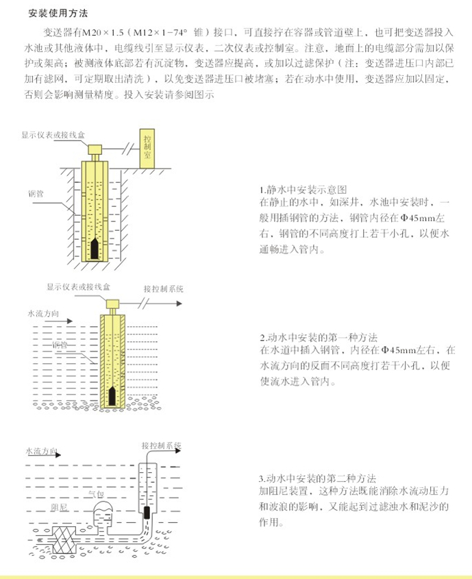 PT311型投入式液位變送器(也稱靜壓式液位變送器)選用進(jìn)口帶防腐膜片敏感組件,將芯片裝入一個(gè)不銹鋼(或PVC)殼體內(nèi),頂部的鋼帽起保護(hù)傳感器膜片的作用,同時(shí)使液體流暢地接觸到膜片。該產(chǎn)品用特制的防水中空電纜使感壓膜片的背壓腔與大氣良好相通,測量液位不受外界大氣壓變化的影響,測量準(zhǔn)確,長期穩(wěn)定性好,并具有優(yōu)良的密封及防腐性能,可直接投入水、油等液體中長期使用。PVC材料的外殼及電纜可測量多種防腐蝕性液體。